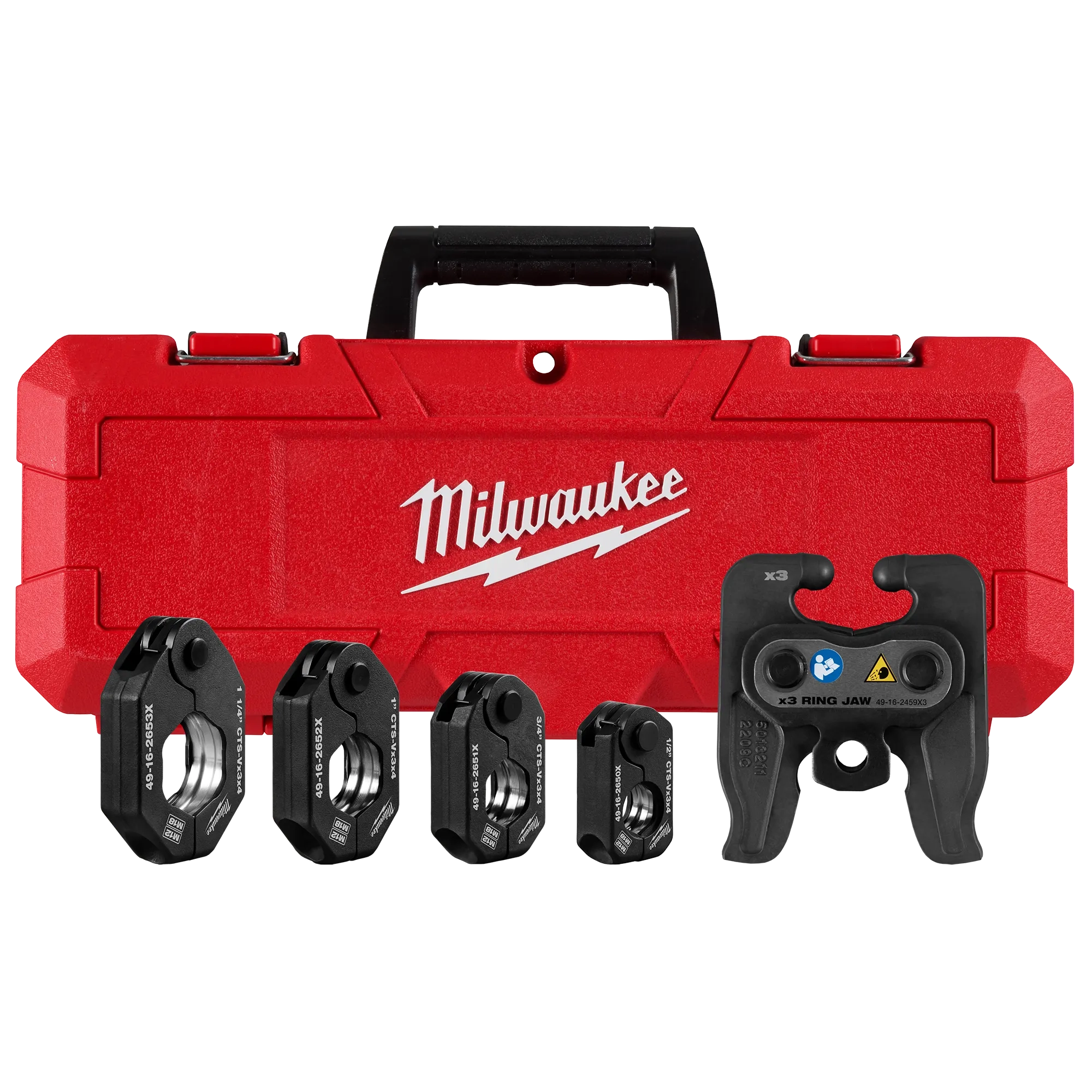 Our 1/2" – 1-1/4” CTS-V Pivoting Press Ring Kit is designed for use with the M12™ FORCE LOGIC™ Press Tool on Viega® ProPress®, ApolloPress® and other press fitting systems. The CTS-V Pivoting Press Ring Kit is a more efficient alternative to sweat and solder, enabling you to press connections on 1/2" – 1-1/4” copper and copper tube-sized (CTS) stainless steel pipe. Pivoting functionality delivers greater access in tight spaces when paired with the X3 Ring Jaw & M12™ FORCE LOGIC™ Press Tool. Additionally, MILWAUKEE®'s press blocking system prevents improper ring and ring jaw mismatch providing peace of mind in quality connections. The 1/2" – 1-1/4” CTS-V Pivoting Press Ring Kit, combined with the ring jaw and in-line M12™ FORCE LOGIC™ Press Tool, delivers unrivaled access in tight spaces and around installed pipes, providing you with controlled, flameless copper connections for unmatched productivity.